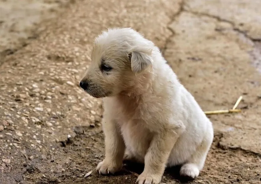 The puppy tried to move back, scared of everything, but he was too tired to run.