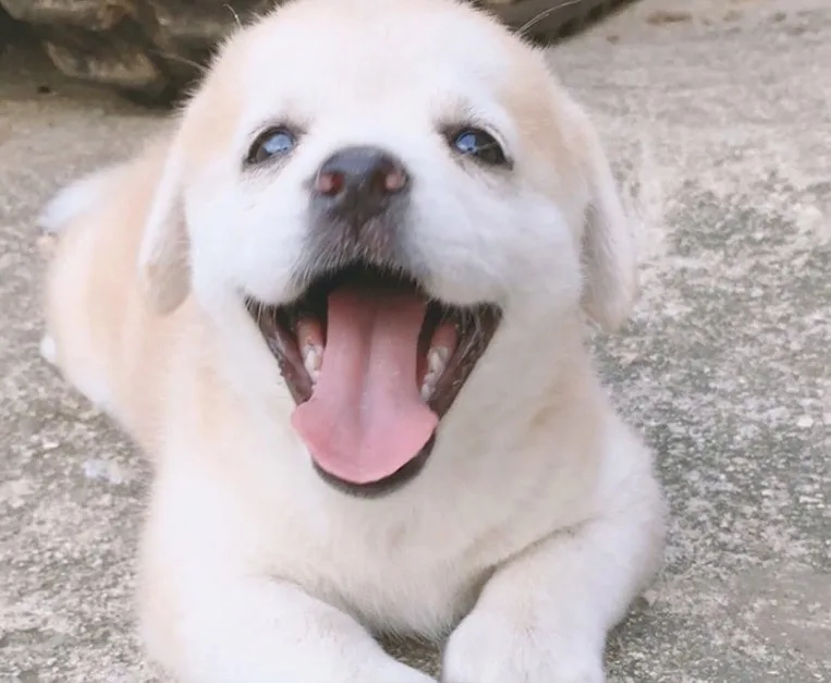 The dog tilted his head, stuck out his tongue, and showed off his bright smile.