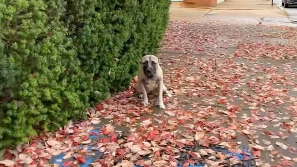 The young brown dog was still sitting on the damp sidewalk, surrounded by fallen leaves, looking completely lost. She didn’t bark or run. She just cried softly, as though hoping someone would finally come for her.