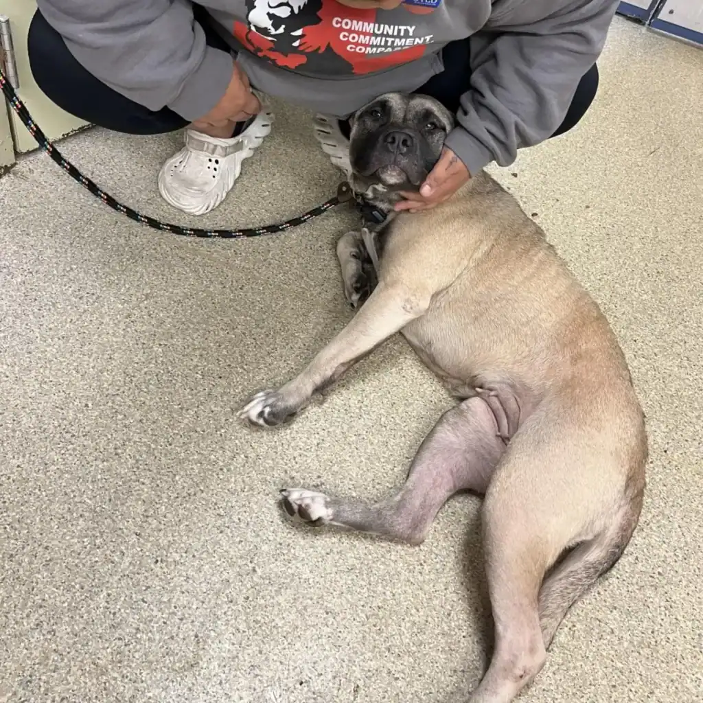 But on Pine Street, something caught the attention of a passing mail carrier — something so painful it stopped them cold. As they slowly approached an intersection, they noticed a car come to a crawl, the passenger door open, and a brown dog pushed out into the rain.