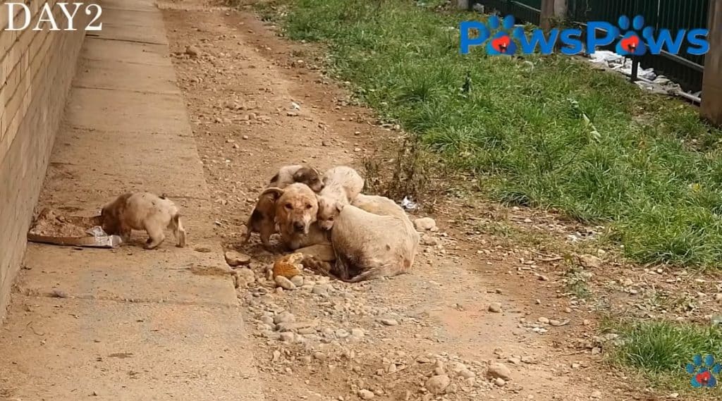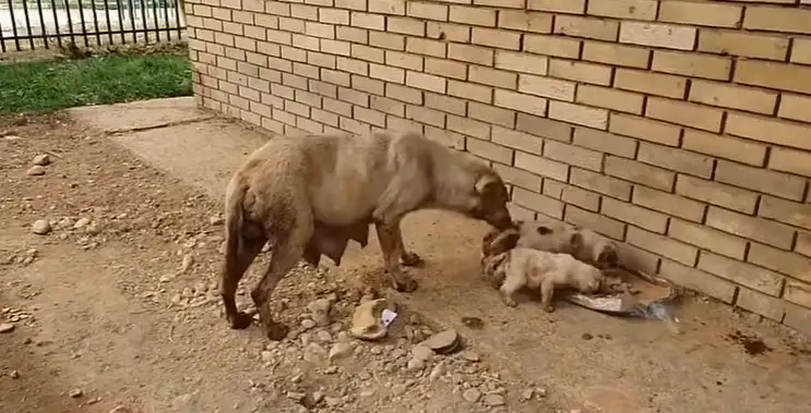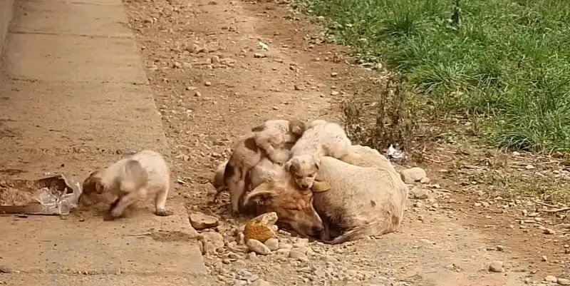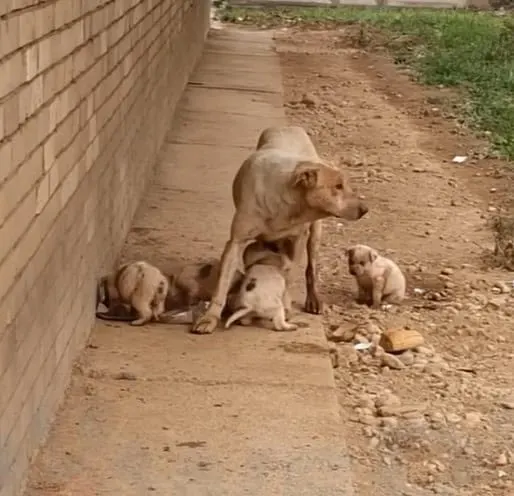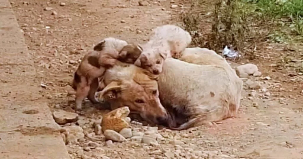 Cura lay curled tightly on the hard ground, her thin body wrapped around her newborn puppies like a living shield.