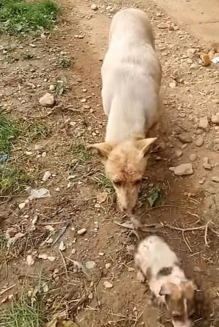 She stood between her puppies and the strangers, trembling but refusing to step aside.