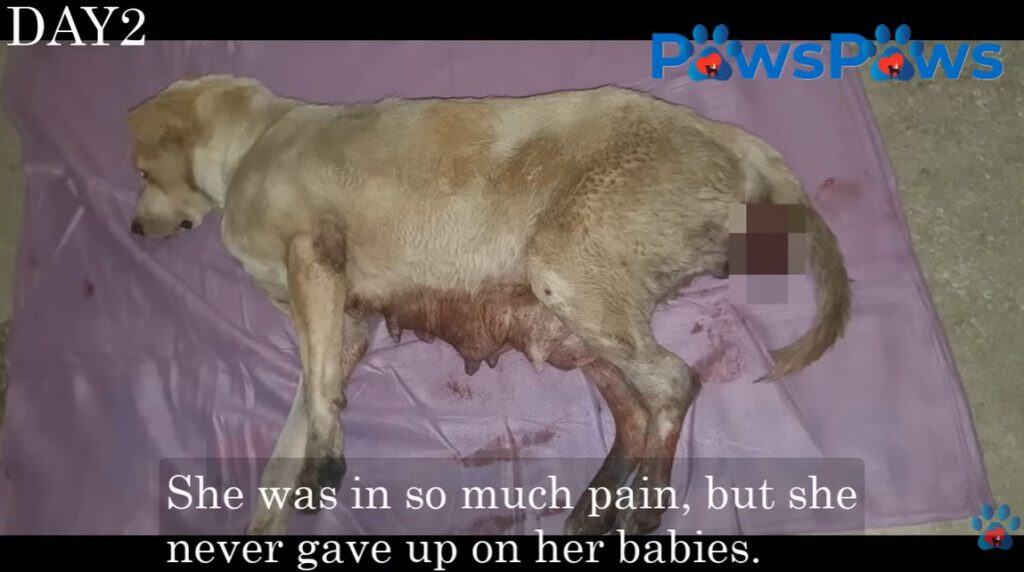 Her puppies cried softly nearby.