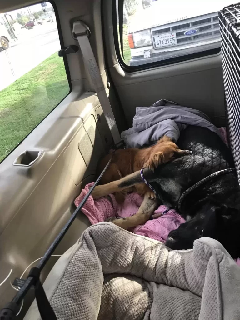 As they drove away, he leaned gently against her, resting his head on her stomach. For the first time that day, both dogs closed their eyes — not from exhaustion, but from a small, fragile sense of safety.