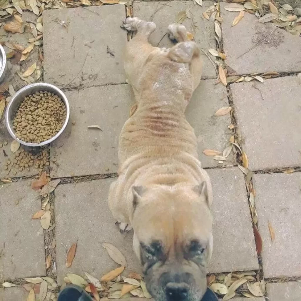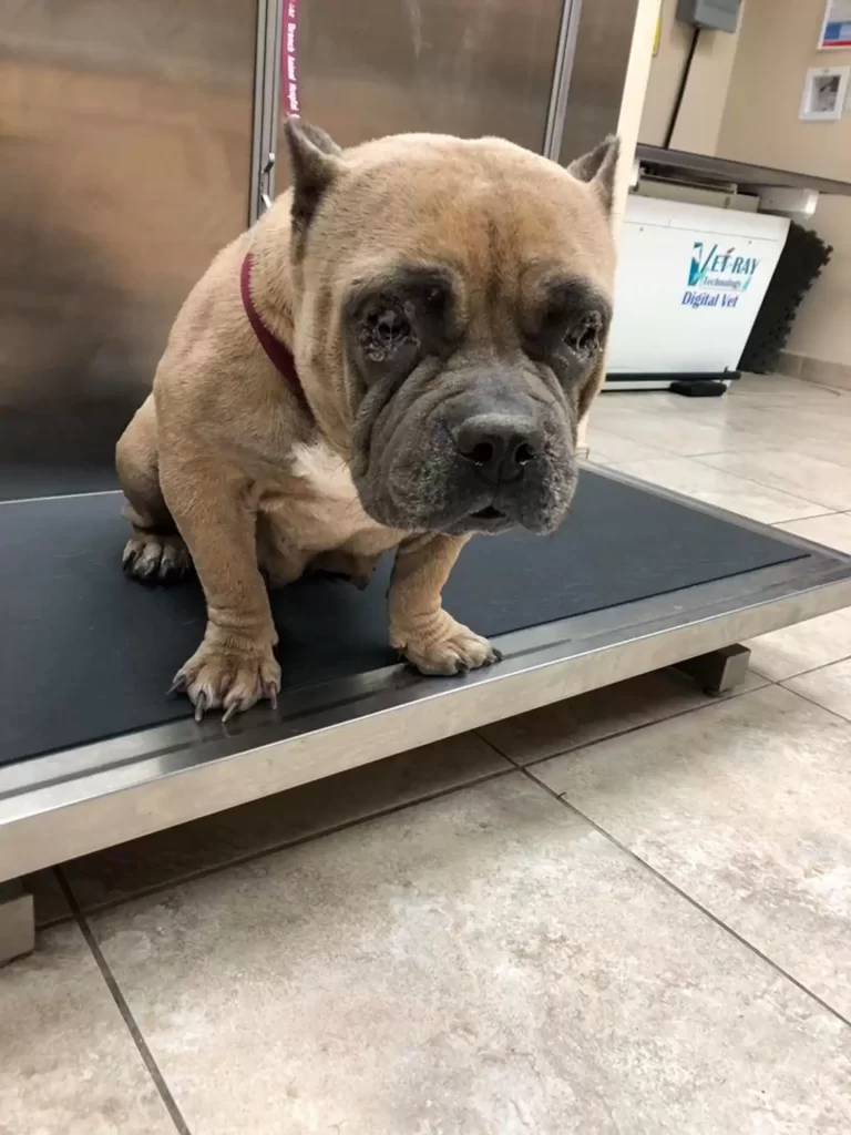 At the vet clinic, everyone gasped when Rubble stepped on the scale — she weighed only 44 pounds, less than half the healthy weight for a dog her size. Her body told the story of neglect: open sores, patches of missing fur, and inflamed skin caused by malnutrition and fleas.
