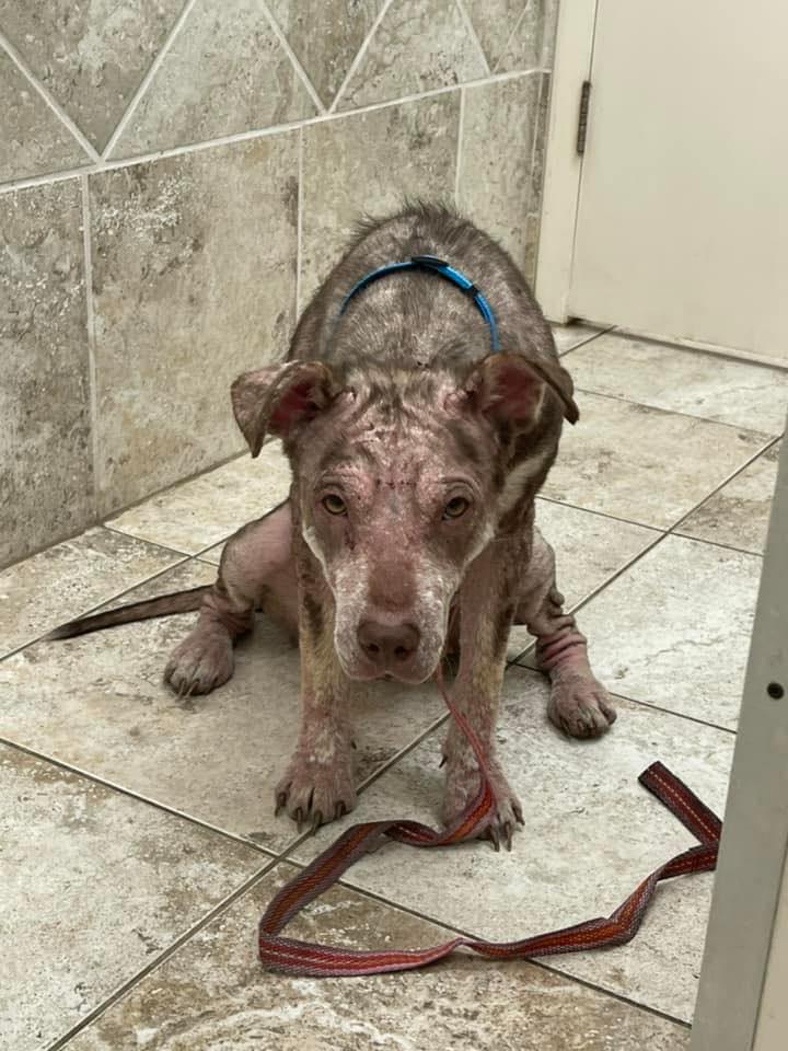 Once inside, the couple could see the full extent of her suffering. Her skin was cracked and raw. Patches of mange covered her body, and small cuts crisscrossed her thin frame.