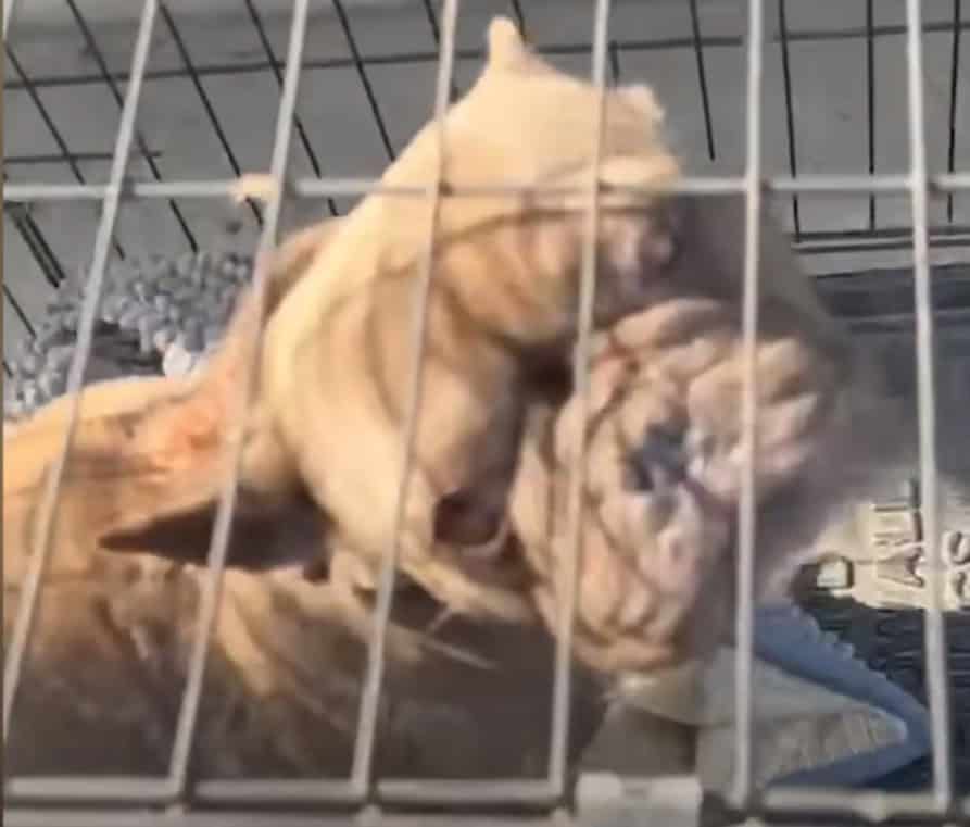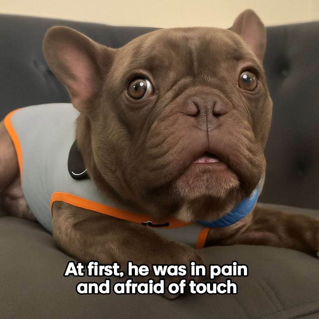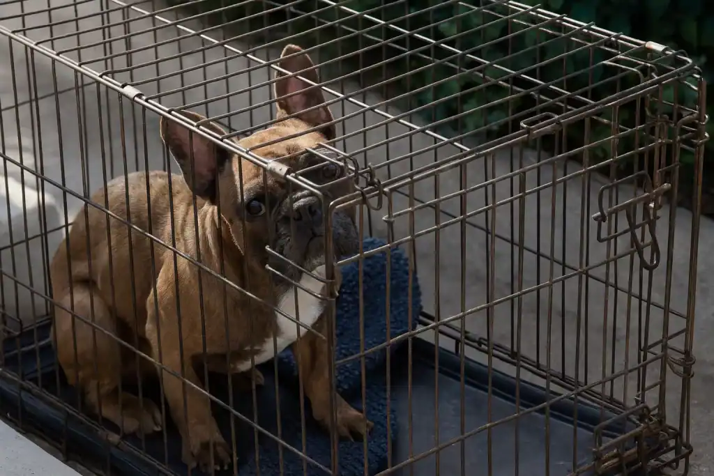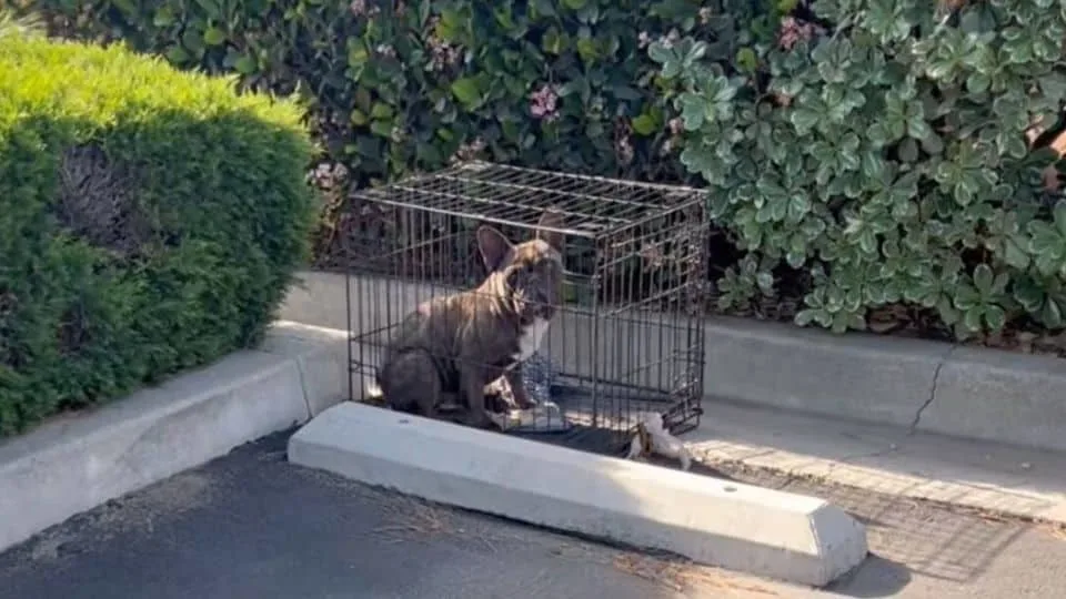 Inside the crate sat a tiny Frenchie, curled into himself like he was trying to disappear.