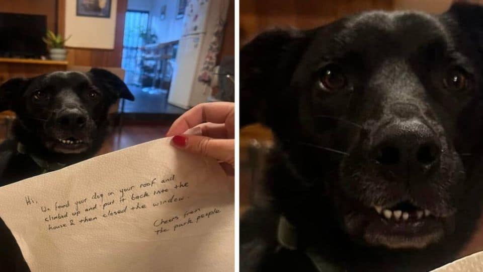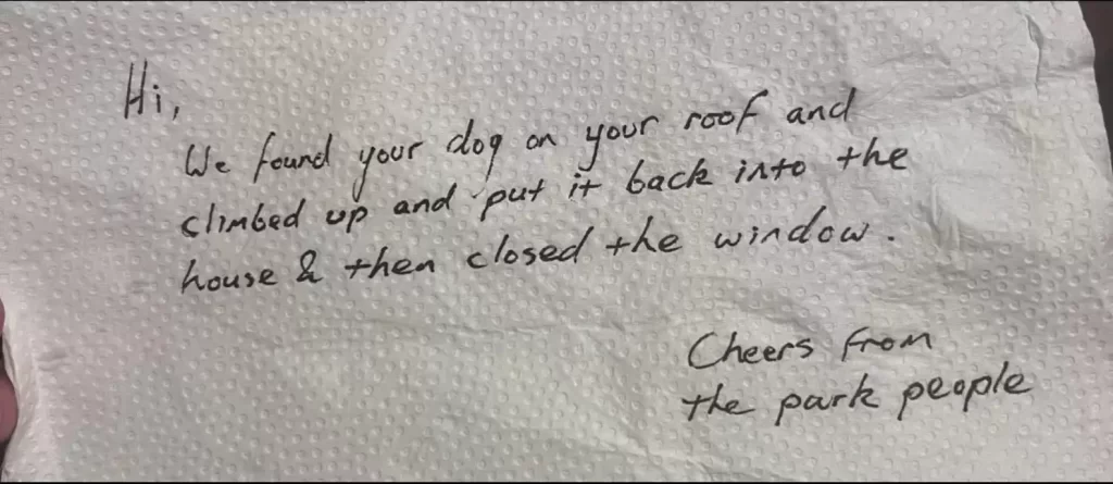 “Hi, we found your dog on your roof … Cheers from the park people.”