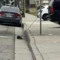 In a quiet Los Angeles neighborhood, a small dog sat motionless beneath a streetlight, his leash wound tightly around a metal pole. The night was …