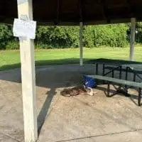 At a quiet park in Syracuse, New York, a gray-muzzled dog lay beside a wooden picnic bench, his body still and tired. His leash was …