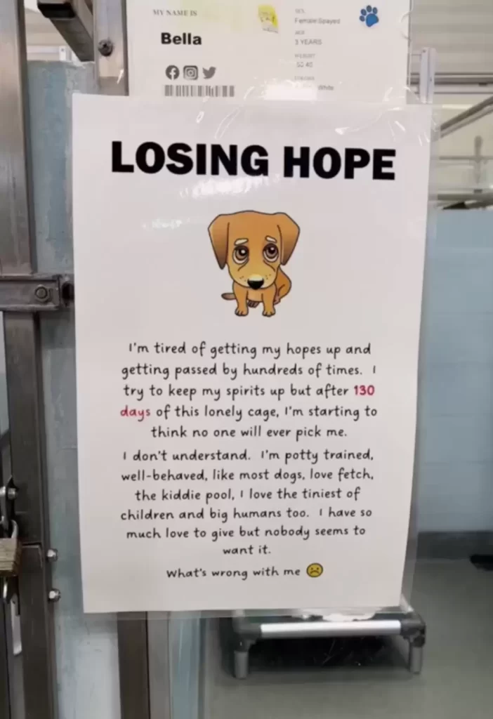 Then came a short video, capturing Bella’s hopeful eyes and the words that pleaded for a second chance.