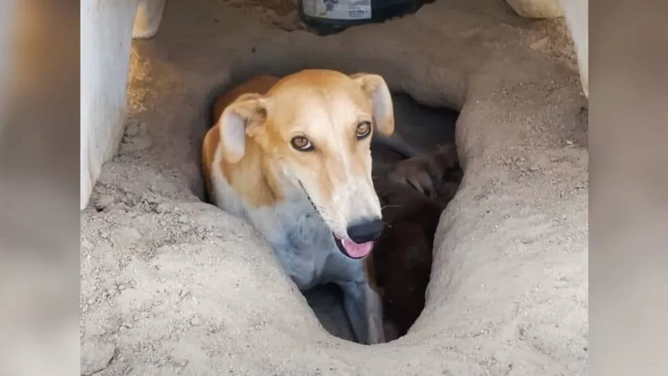 After searching across the scorching sands, the rescuers finally spotted her. She was hidden beneath a large water tank, lying low in the dirt.