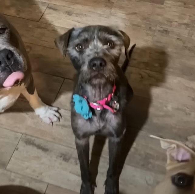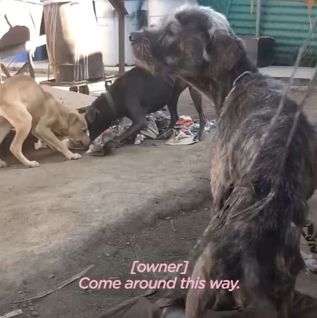 The mama dog stood on weak legs, chain heavy around her neck, eyes soft despite everything.