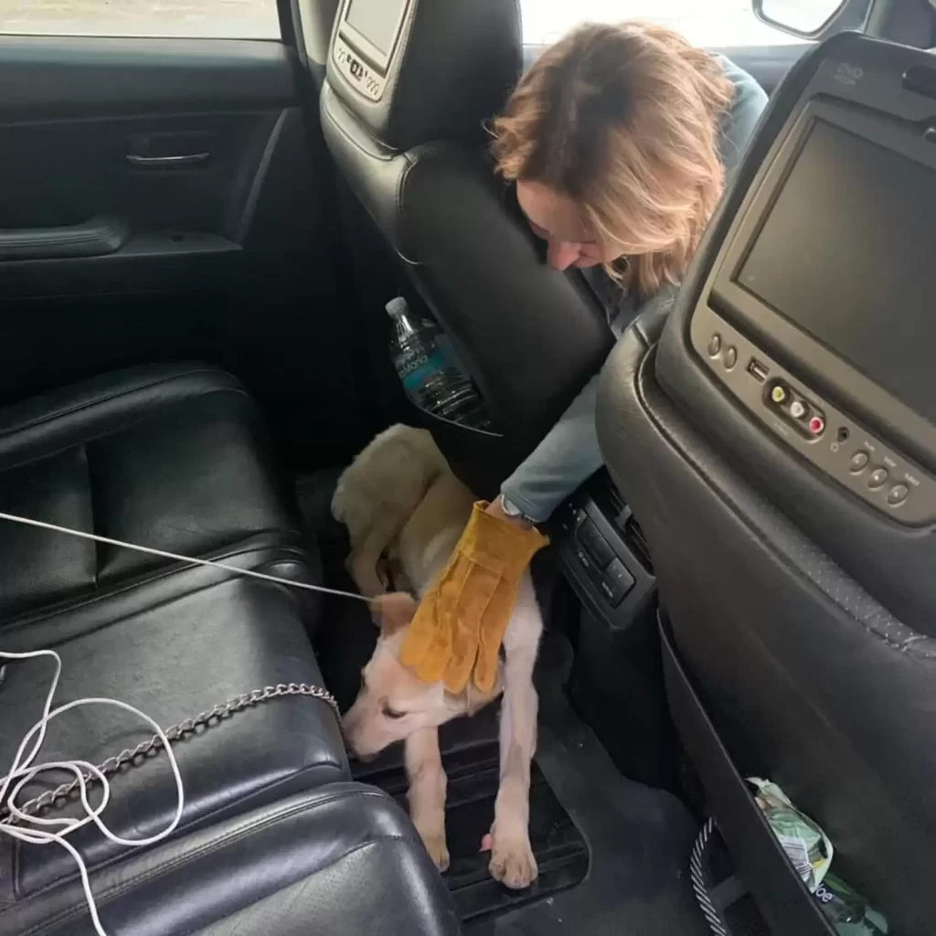 Inside the car, his transformation began. He no longer lashed out. His small body remained stiff at first, but Marcela gently stroked his fur, whispering words of comfort.
