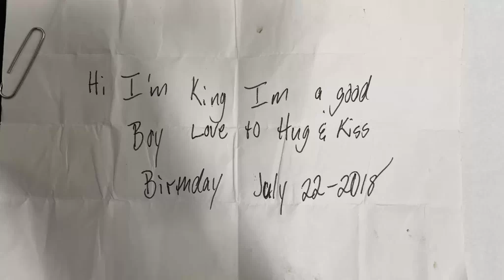 The note revealed his name was King. It said he was born in July 2018, that he loved hugs, kisses, and was a “good boy.”