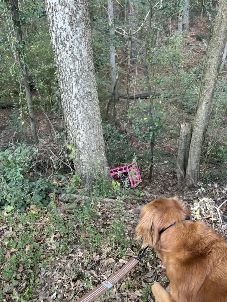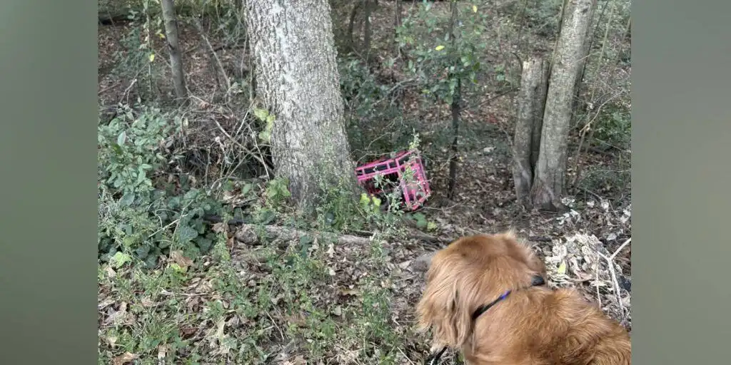 At the bottom of the ditch sat a bright pink crate, strange against the brown earth.
