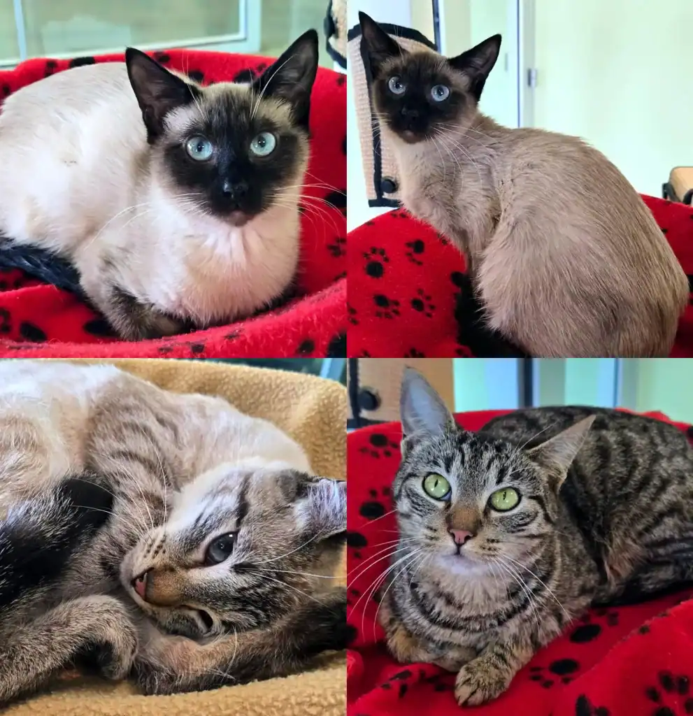 Four cats, trembling, silent, staring with hollow fear.