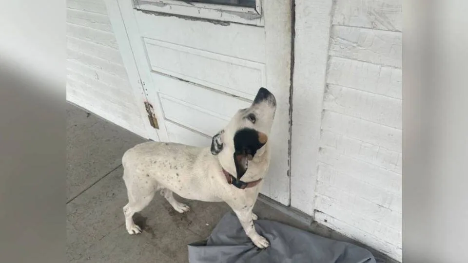 Among dozens of posts, one photo caught her heart — a black-and-white dog sitting alone on the porch of an empty home.