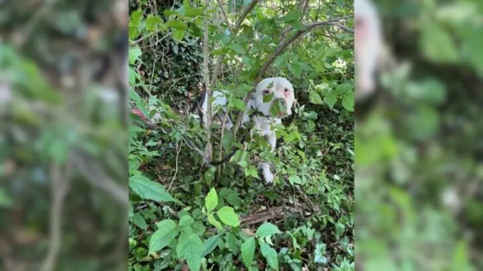In Kentucky, one young white dog faced this heartbreaking reality when his family tied him to a tree near some bushes and walked away. They left him with nothing but a rope around his neck and an empty bowl at his side.