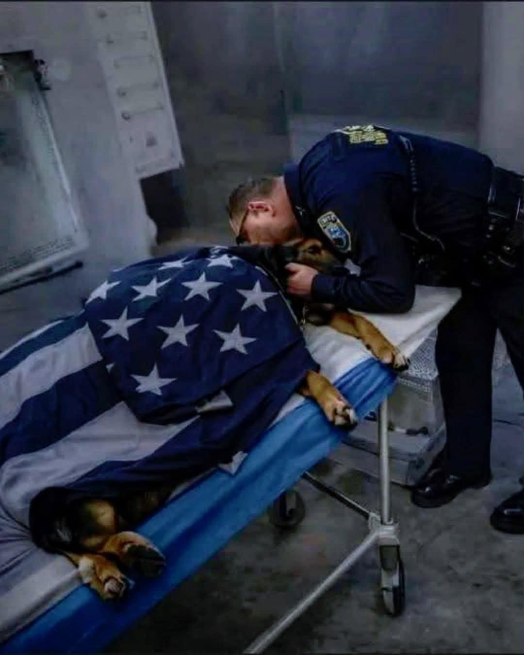 The picture of Falco lying beneath the American flag captures more than sorrow—it carries pride. It tells us that this dog was more than a guardian; he was a symbol of commitment and bravery.