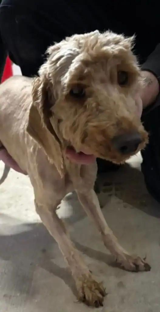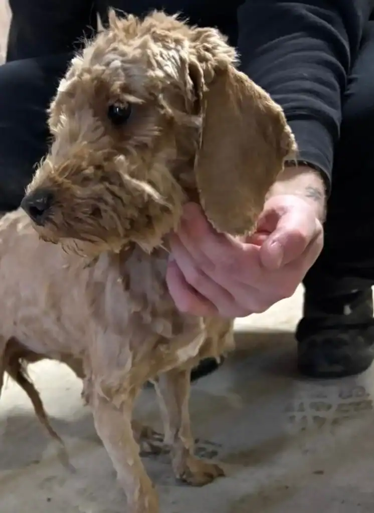 All four puppies needed immediate grooming. Their coats were tightly matted, packed with layers of wet tangles and sawdust that clung stubbornly to their curls.