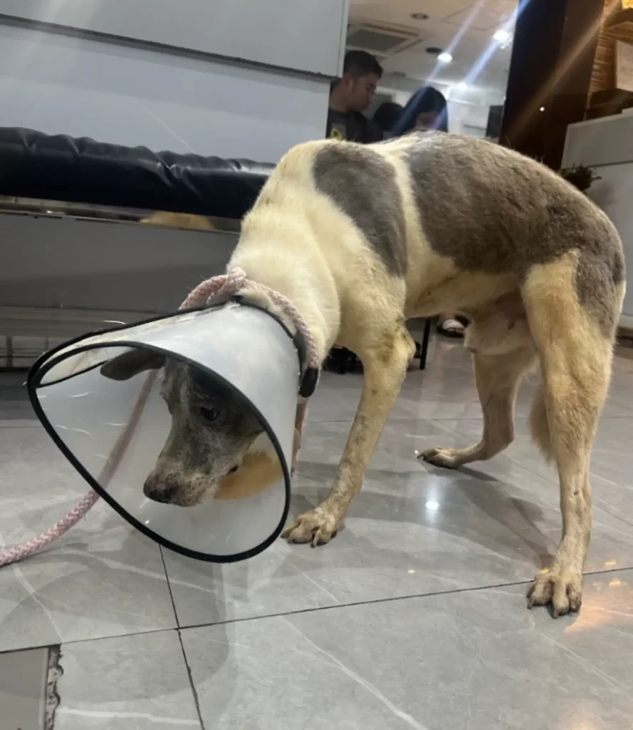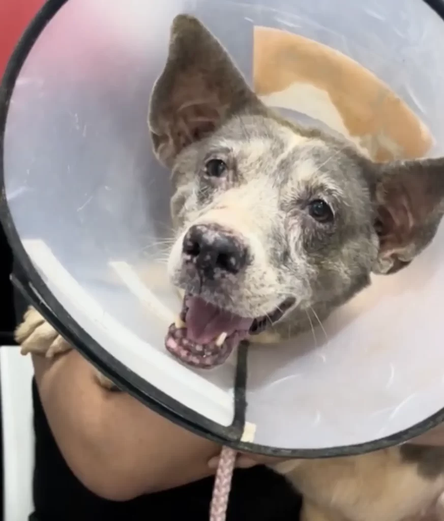 At the veterinary clinic, the exhausted senior dog growled and snapped, unsure what to make of these new humans.