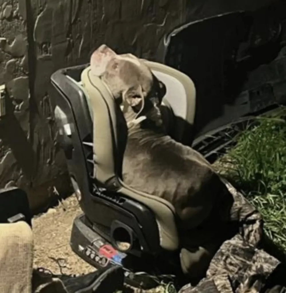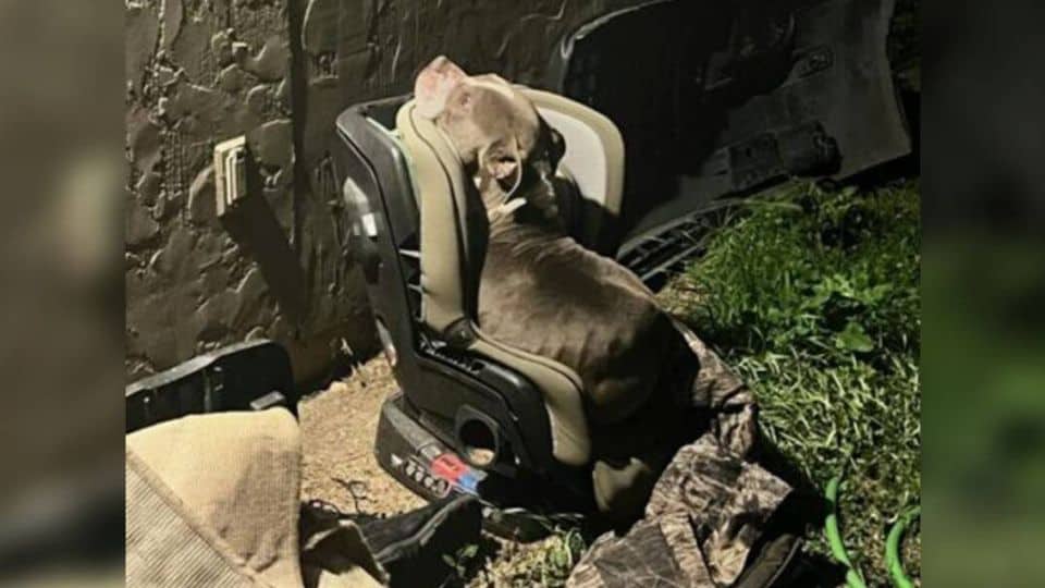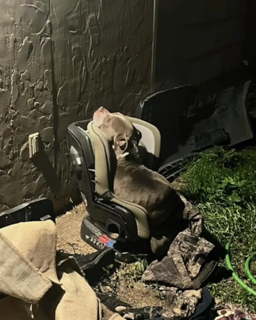 Instead of a fierce animal waiting to lunge, she saw a trembling young pit bull curled into the seat of a broken child’s car seat that had been left in a pile of trash.