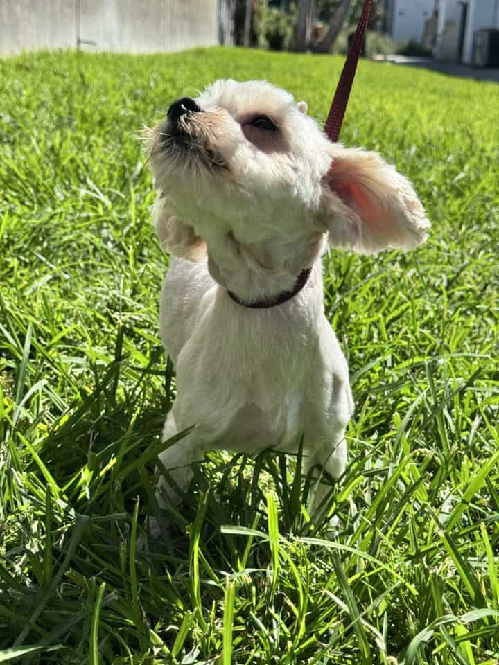 Hidden beneath piles of trash was a small white dog, her fur twisted into painful knots that hung like chains around her body.