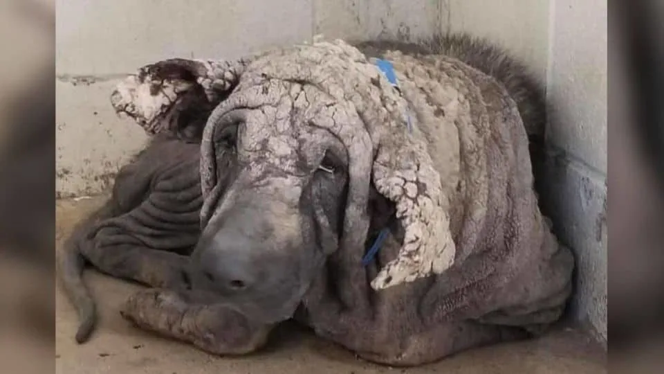 When rescuers first saw him, the dog barely looked alive. His skin was cracked and gray, his body thin and motionless, as if he had been carved from rock.