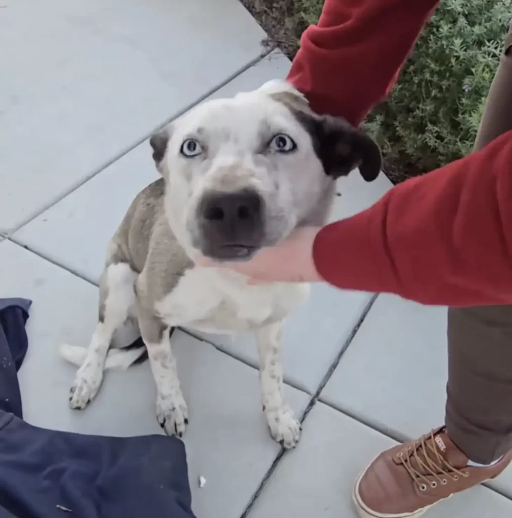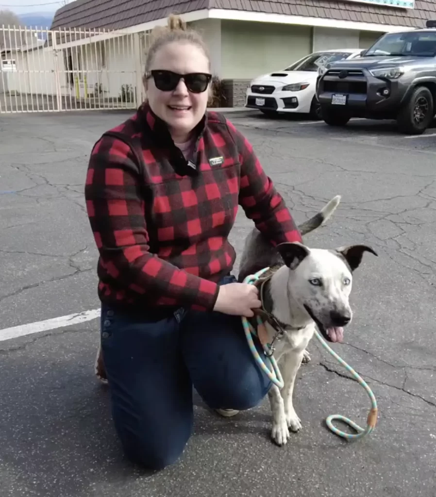 At first, the dog wanted nothing to do with anyone. She glanced nervously at the two rescuers, unsure whether to run or stay. Her blue eyes darted around the parking lot, searching for a familiar face that wasn’t there. The Spagises spoke softly, inching closer each time the pup took a hesitant step back.