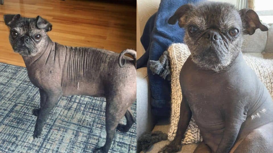 The little dog clearly had the face of a pug, but something about her bare skin hinted at another breed hiding in her family tree.