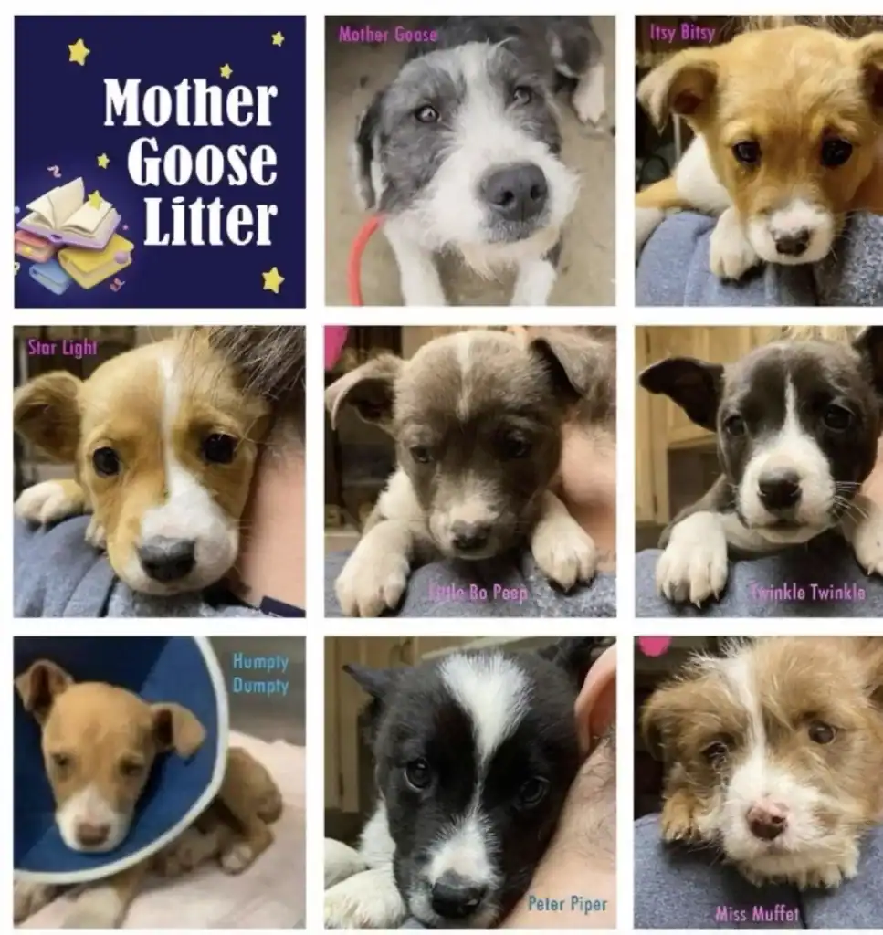 Their mother — now lovingly named Mother Goose — watched proudly as her babies grew stronger. Each puppy was given a fairy-tale name, fitting for the little family that had survived so many dark chapters.