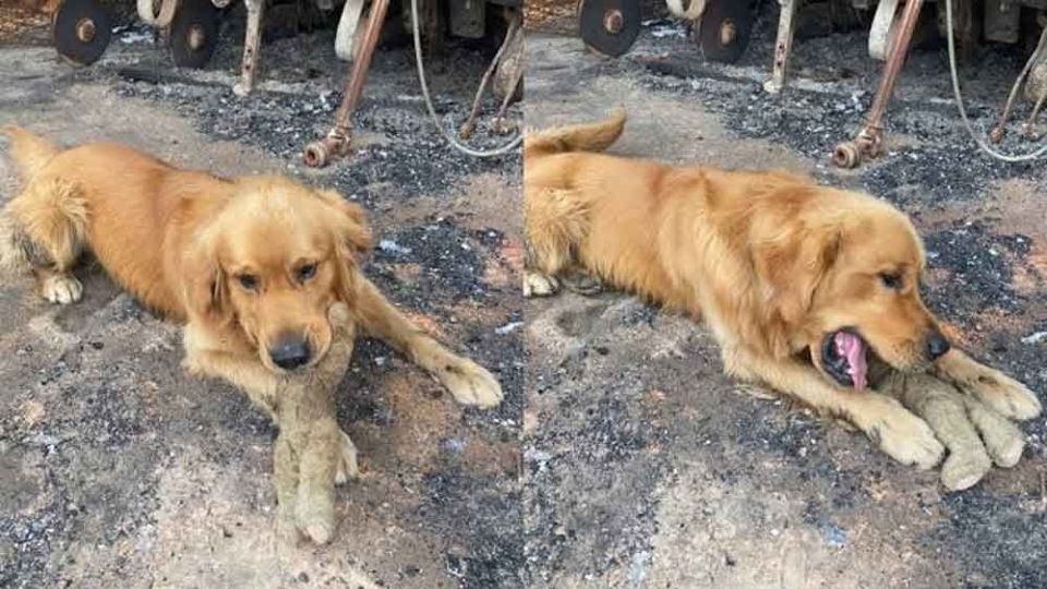 Katie gasped when she saw him wagging his tail, his mouth wrapped tenderly around the soot-covered toy.