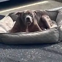 In an empty parking lot in Austin, Texas, a gray-faced pit bull waited quietly beside her worn-out bed. The pavement shimmered beneath her in the …