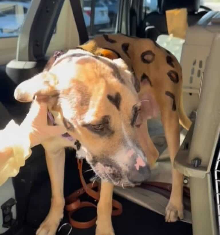 Someone had deliberately painted spots across her fur to mimic the look of a leopard. The unusual pattern gave her an almost surreal appearance, but behind it was only suffering and neglect.