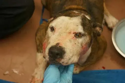 “I can’t not take her,” she said softly as she knelt to stroke the dog’s scarred face.