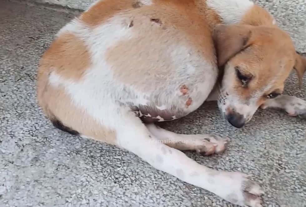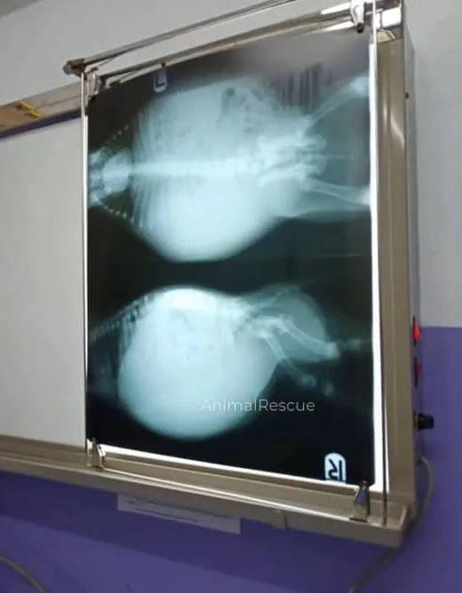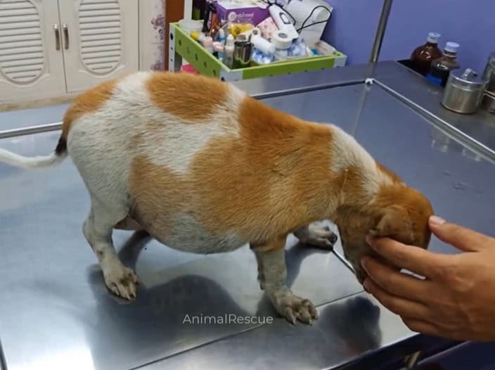 The vet touched her swollen belly.