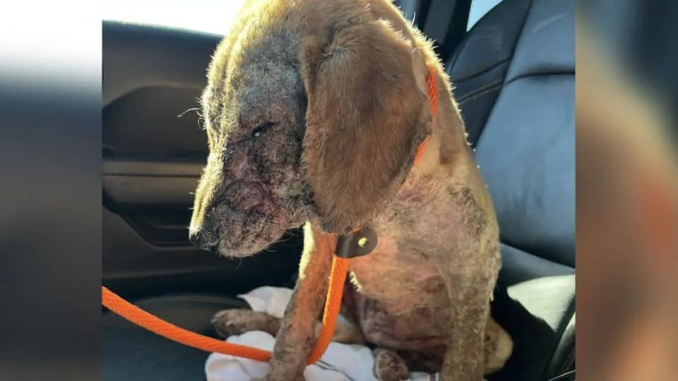 They found her huddled on a property, her patchy skin evidence of a serious health problem. Carefully, they scooped her up and held her close, giving her the first moment of safety she may have felt in a long time.