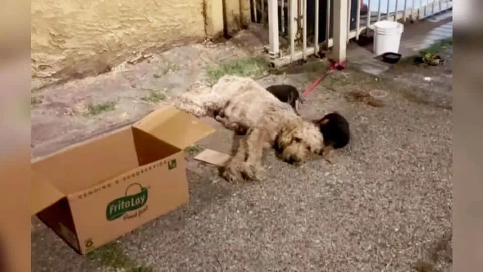 The leash around her neck was so tight that not even a finger could slip beneath it. She was covered in fleas, and her thin body told the story of a life filled with neglect.