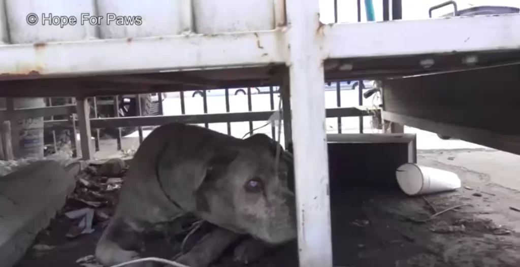 A Lonely Dog Hiding Beneath the Dumpster