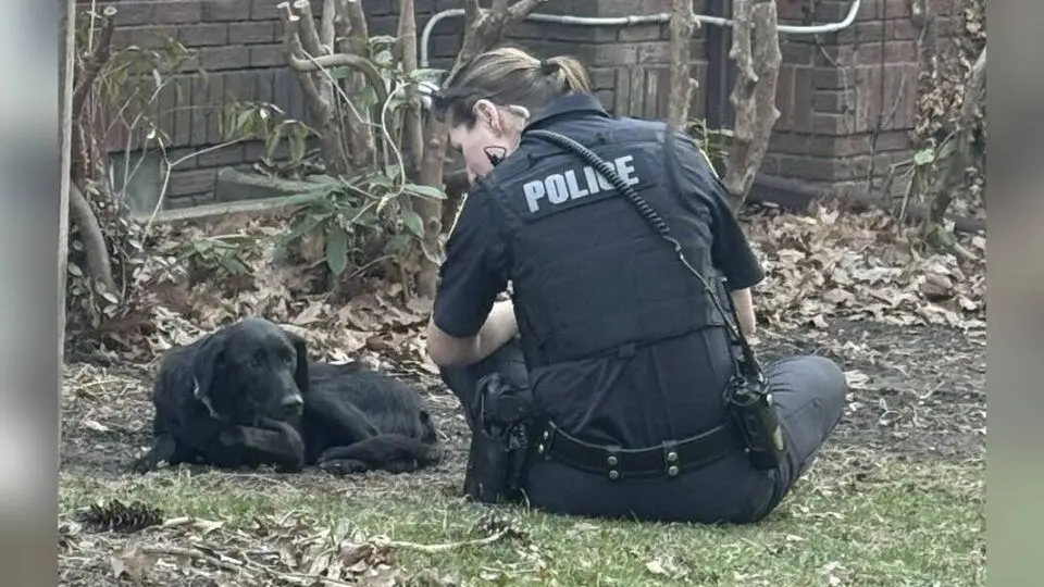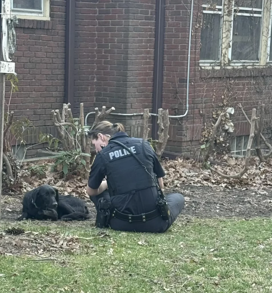 Feidler didn’t move. She simply waited. Slowly, the dog’s breathing eased. Her tail flickered, uncertain but hopeful. When Feidler finally reached out her hand, the pup didn’t pull away. She let the officer’s hand rest on her head for the first time in what must have felt like forever.