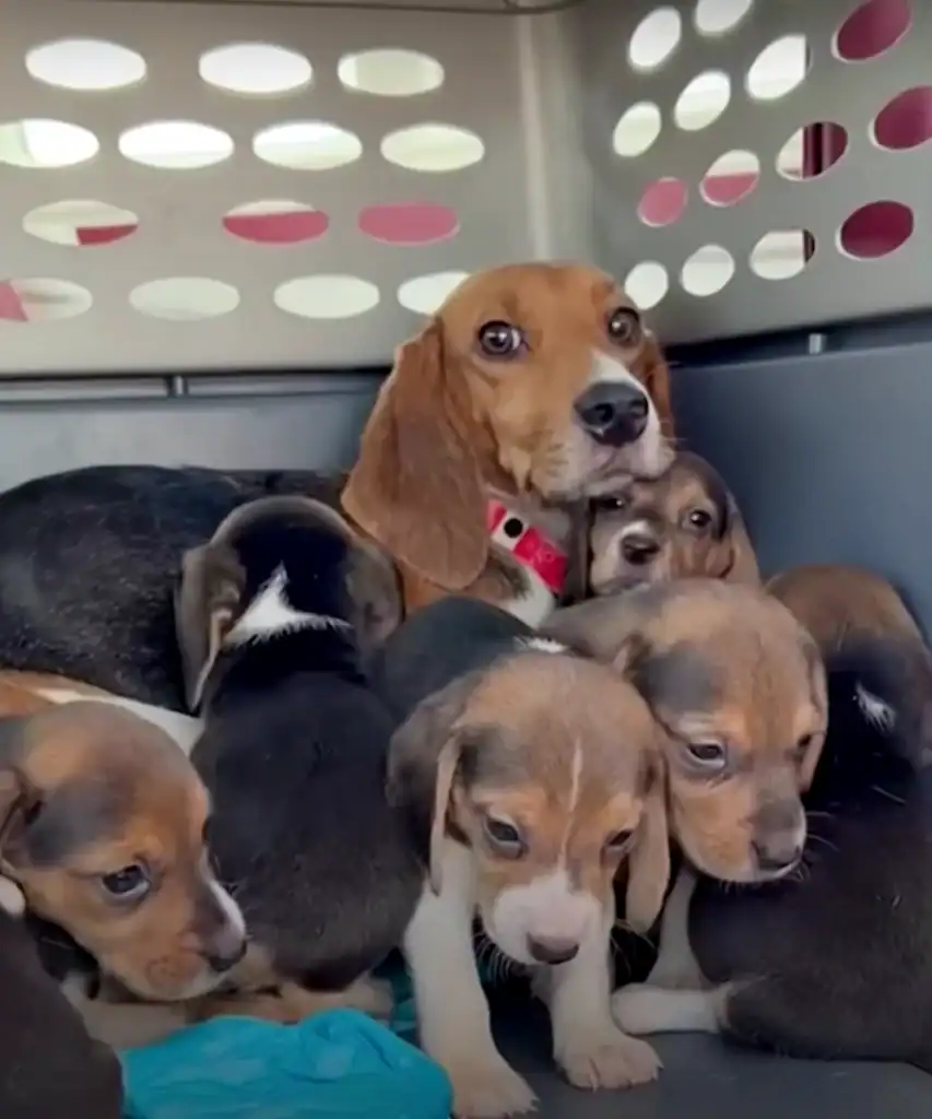 Seven tiny puppies wiggled beside her.