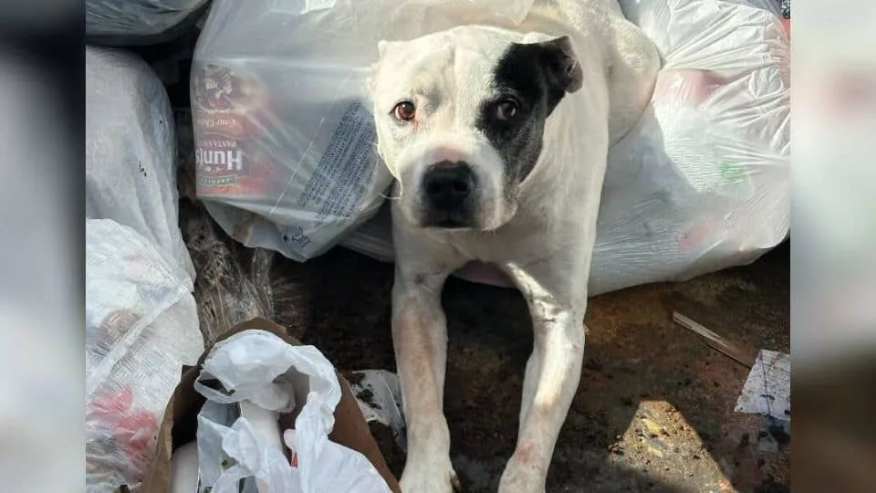 It was a senior pit bull mix, huddled among the trash, trembling and alone.