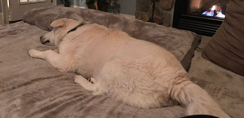 He sleeps on the couch by the fireplace, letting the warmth hug his old bones.