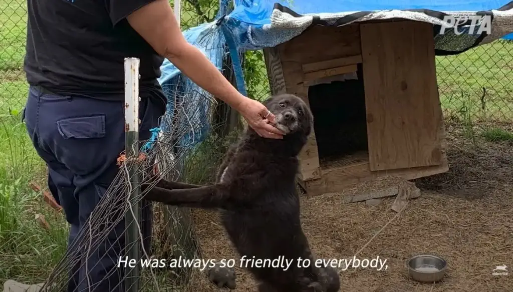 The person knelt down, close enough to see the sores on his neck from the chain.