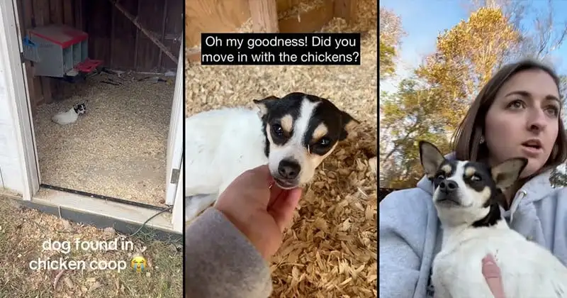 One morning, Madison went out to check on her chickens and found someone unexpected — a little dog curled up inside the chicken coop, waiting for someone to notice her.