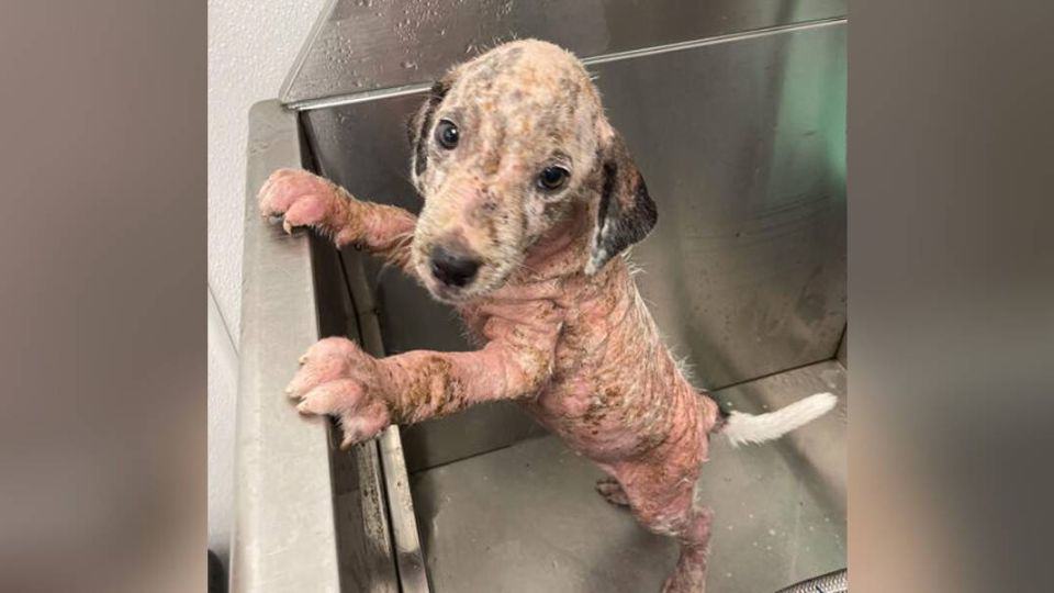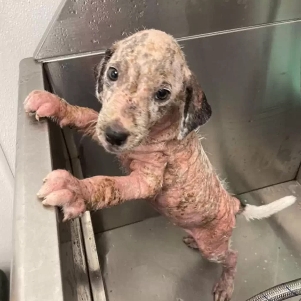 When volunteers at a Texas shelter first spotted the trembling little body, their hearts sank. The puppy was nearly hairless, his skin raw and irritated, and his eyes dulled with exhaustion.