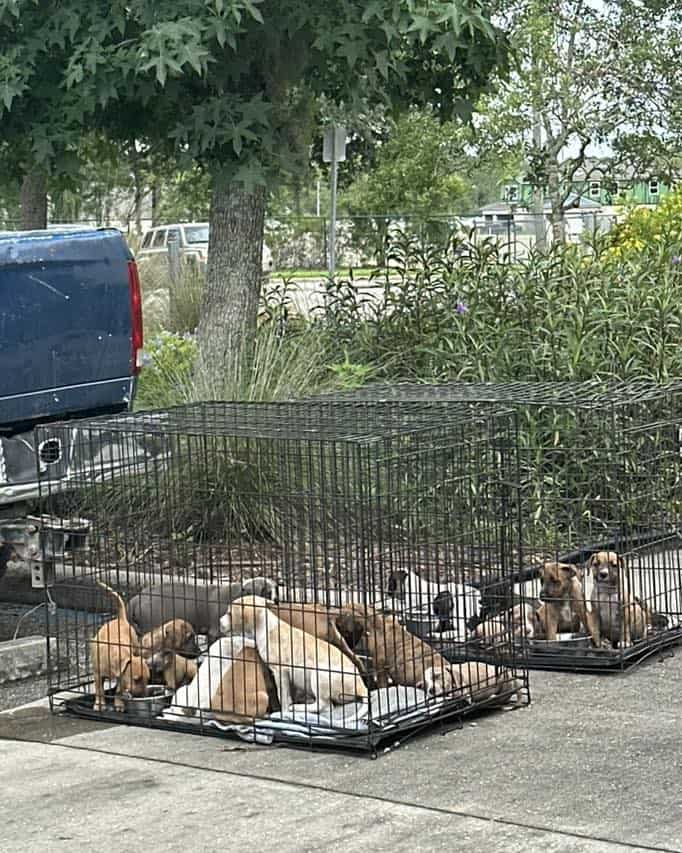 Sixteen little ones, barely old enough to understand the world, sat packed inside several hard plastic crates. The pavement beneath them was hot enough to sting paws, and the breeze did little to cool their fragile bodies.