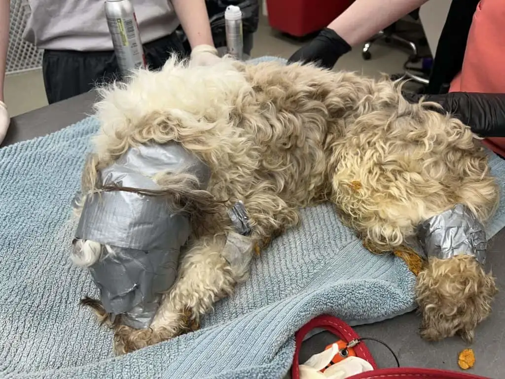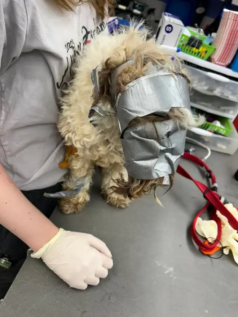 Veterinary staff sedated him and started carefully removing the tape.
