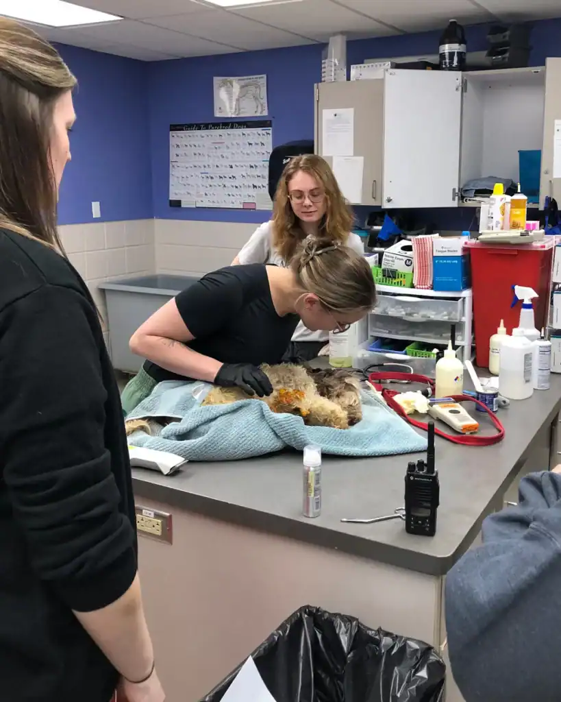 Food scraps and debris were matted in his fur, so the team had to shave him clean to free him from everything stuck to him.